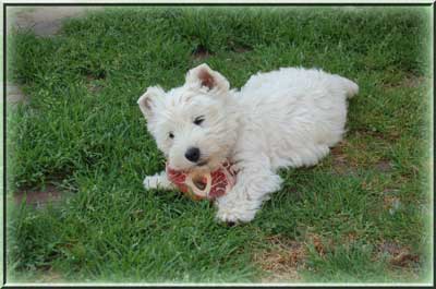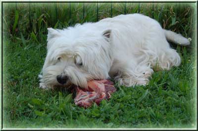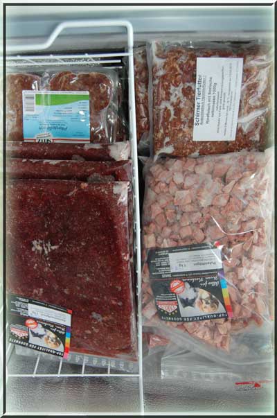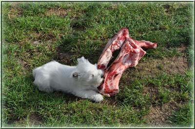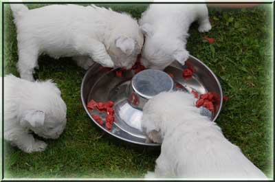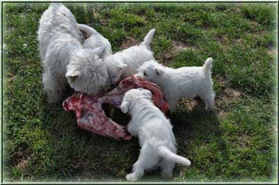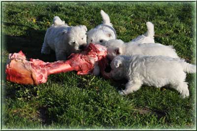und so sieht die Fütterung bei uns aus, Welpen bekommen mit der 4. Woche ihre 1. feste Nahrung, gewolftes Rindfleisch, Kaninchenfleisch und mit gut 6 Wochen bekommen sie ihren 1. Knochen, der sehr groß sein muß, damit er nicht verschluckt wird.